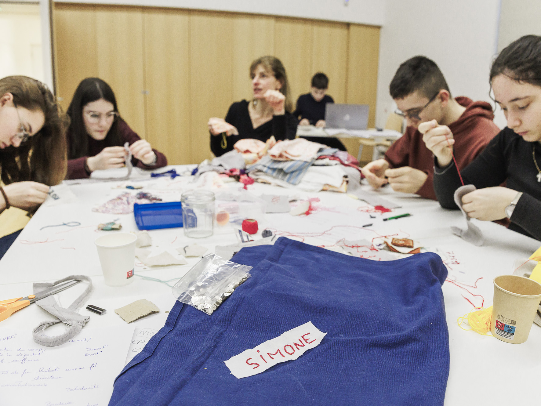 Durant deux jours, ils ont ensuite pu concevoir, créer, broder, coudre accompagnés de Franck Claudon. L'artiste les a guidés, les a aidés à définir un axe de création, un concept, à trier leurs idées pour aboutir à un projet précis et capable de dire avec sensibilité ce que leur ont inspiré les destins de trois femmes survivantes des camps : Simone Veil, Ginette Kolinka et Marceline Loridan-Ivens. Franck Claudon a aussi apporté son savoir faire technique pour la mise en œuvre du travail, il était pour cela accompagné de deux généreuses couturières de la La P'tite Manu Textiles.